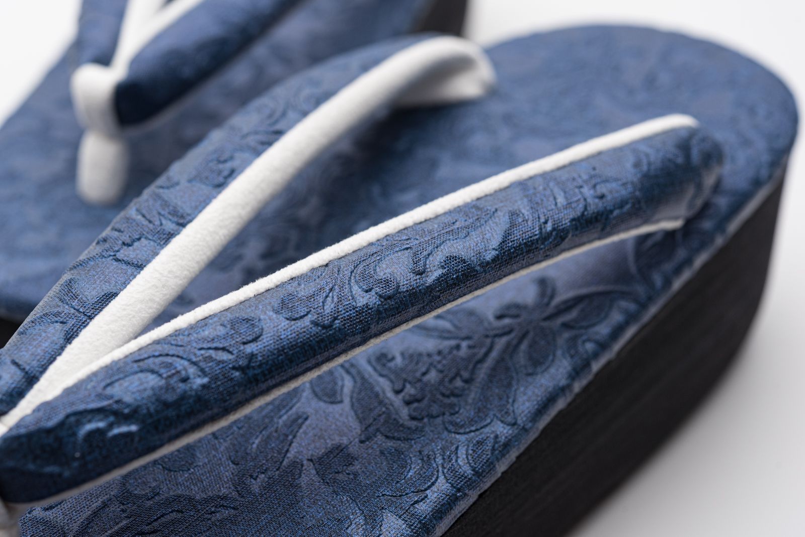 落ち着いた青色の台にエンボスのボタニカル柄が仄かに浮かぶカフェ草履です。